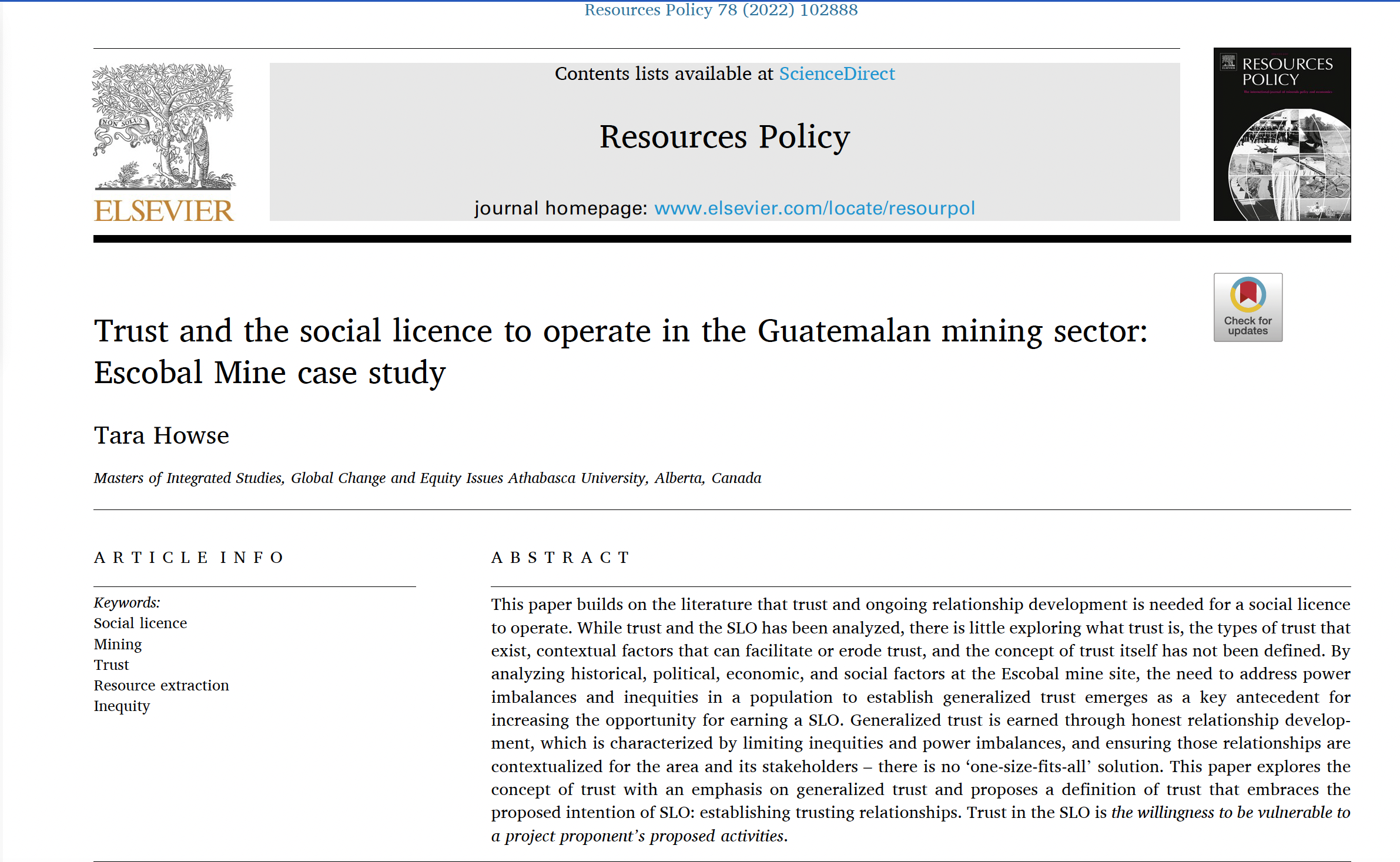 Howse, T. (2022). SLO, Trust, and Conflicts in the Mining Sector: Escobal Mine Case Study. Resources Policy.